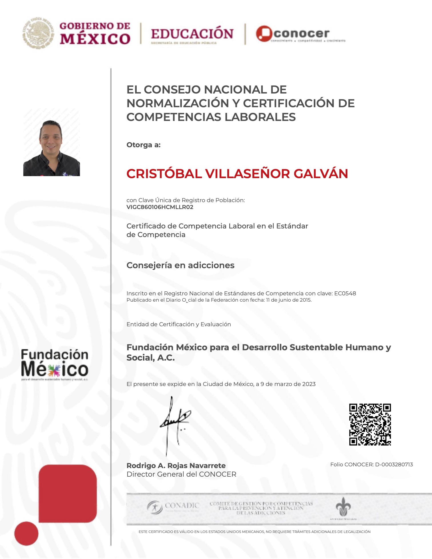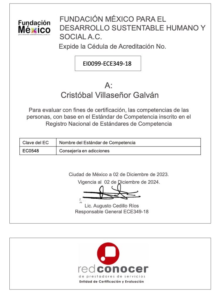 Ser Evaluador de Competencias acreditado ante el CONOCER me permite certificar a profesionales en el campo de las adicciones, asegurando que cuenten con las habilidades y conocimientos necesarios para brindar una atención de calidad. Esta acreditación me otorga la capacidad de evaluar objetivamente las competencias de consejeros y especialistas, garantizando que se adhieran a los más altos estándares de intervención. Además, me permite fomentar el desarrollo profesional en el sector, impulsando una mejora continua.